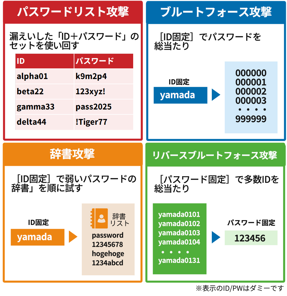 リバースブルートフォース攻撃 | 単一のパスワードを固定し、多数のIDでログインを試す | 安易なパスワードを使っている利用者が狙われやすく、複数アカウントが同時に被害を受ける恐れがある。 |